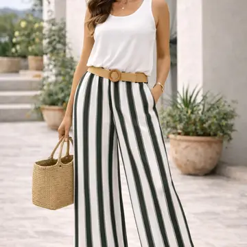 Randig byxa med vida ben, fickor och hög midja med resår. Bälte ingår