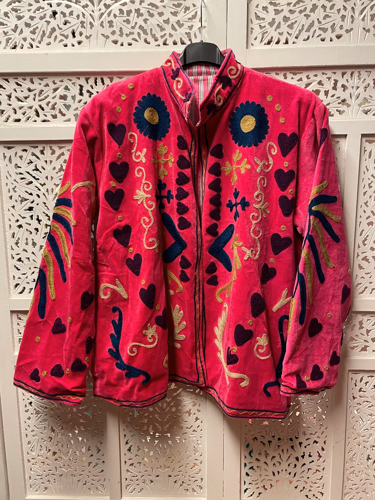 Jacka i bomullssammet med Suzani-broderi. Passar lika bra till jeans som klänning.Fodrad med bomullstyg. Storlek: One size (ca 36 - 42)Finns endast ett exemplar